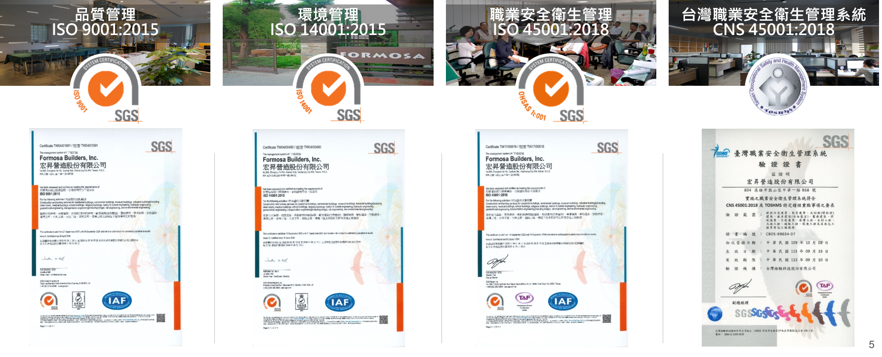 宏昇營造是目前台灣甲級營造極少數同時榮獲 ISO 9001品質管理、ISO 14001環境管理、ISO 45001職安衛管理及台灣職業安全衛生管理系統 CNS 45001驗證的廠商,施工過程中除追求最佳工程品質外、對勞工安全以及環境保護同樣都非常重視,不遺餘力,務求「工安零事故」、「環境零汙染」。